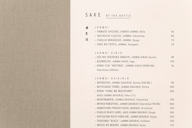 精明有效地引導(dǎo)餐廳的概念和材料質(zhì)量。這些是文字和可觀察的,但也是微妙的和內(nèi)臟的。前者真正體現(xiàn)在菜單封面的面料上,類似于座椅的面料,以及米紙的半透明質(zhì)量,它吸收周圍的材料和持有它的人的手。