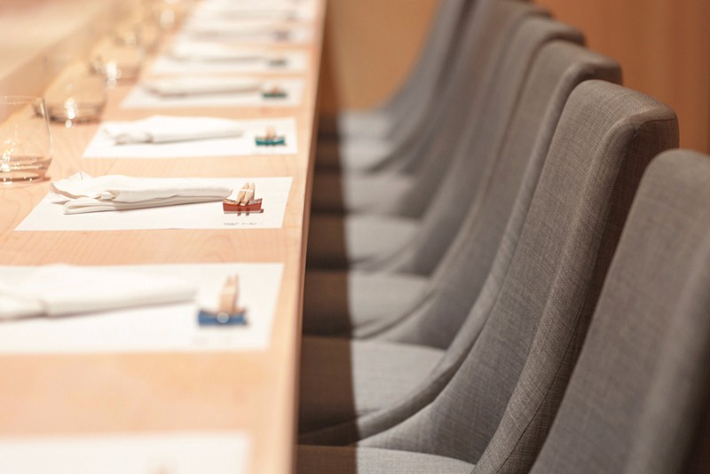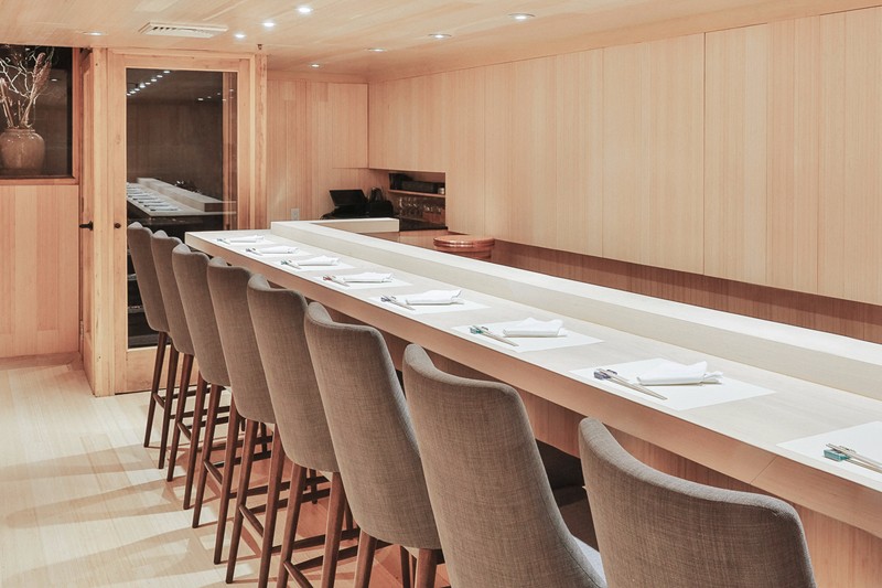 餐廳擁有柔和的竹子和織物的淺色室內(nèi)設(shè)計,以日本極簡主義傳統(tǒng)為中心。材料質(zhì)量高但質(zhì)量高,天花板低,桌子的設(shè)計和椅子布局為餐廳帶來了安靜而樸實的材料質(zhì)量,幾乎沒有分心,與廚師建立親密關(guān)系,專注于食物。